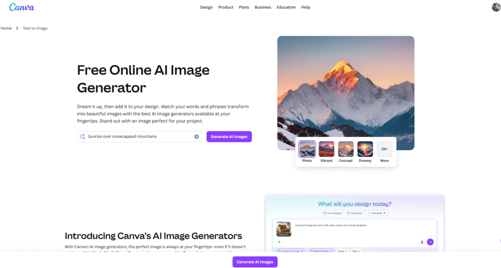 Canva’s built-in AI tool is perfect for creators, freelancers, and social media users. It allows you to generate images directly inside Canva’s design editor. This is ideal for making YouTube thumbnails, banners, posters, flyers, and ads. It’s free and very beginner-friendly.