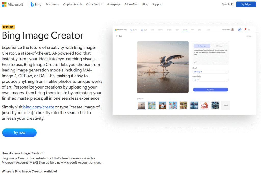 Bing Image Creator uses OpenAI’s DALL·E technology and is completely free through Bing. It’s fast, easy, and does well with creative concepts and storytelling-style images. If you want quick results without signing up for anything, this one is perfect.