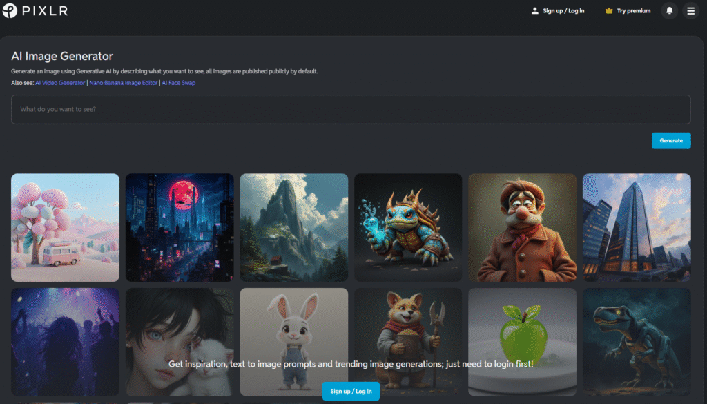 Pixlr’s AI tools are fast and accessible. The free version gives you background removal, image enhancement, and simple generation. It’s perfect for everyday users who need quick edits and lightweight graphics.