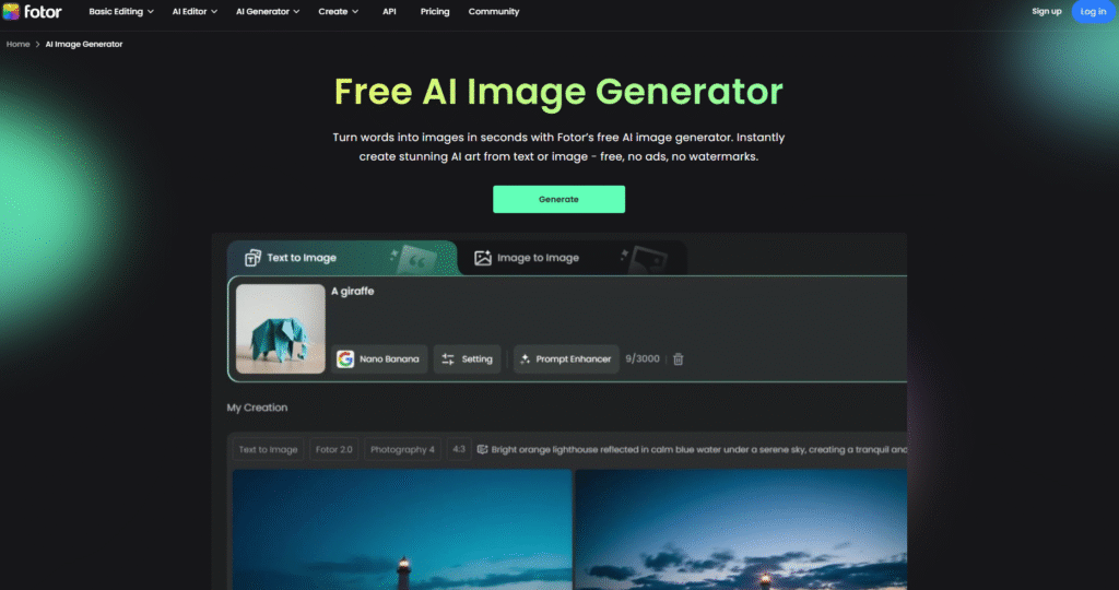 Fotor is known for its easy interface. The AI art generator is great for making portraits, avatars, and creative illustrations. It’s also useful for editing your existing images with artistic filters and effects.