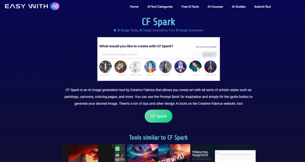 CF Spark from Creative Fabrica is popular among designers and print-on-demand creators. It’s great for generating patterns, stickers, illustrations, and cute artwork. You get free credits daily, and the community is very active.